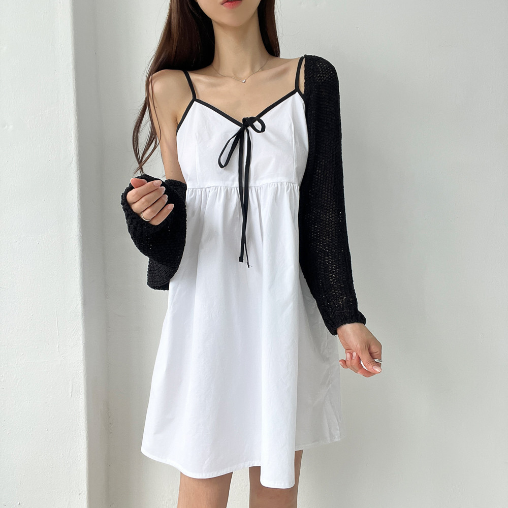 미미 배색 랍빠 브이넥 리본 끈조절 플레어 루즈핏 나시 미니 원피스 3color