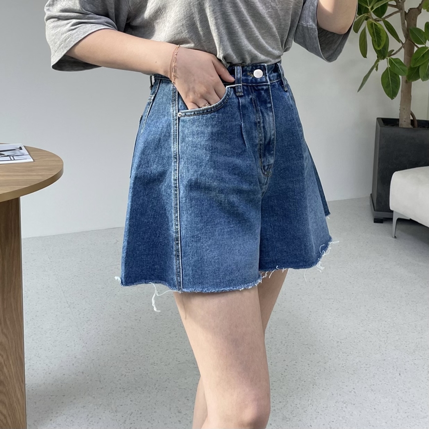 다리가 길어보이고 얇아보이는 a라인 핀턱 진청 데님 반바지