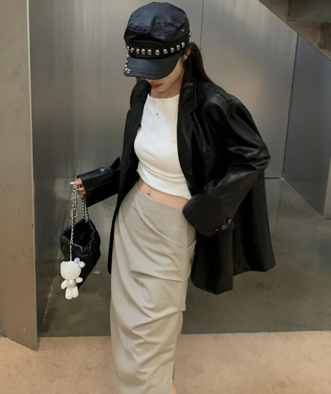 가을 풀 오버사이즈 블랙 라이더 레더 자켓 / 슬릿 가죽 롱 스커트