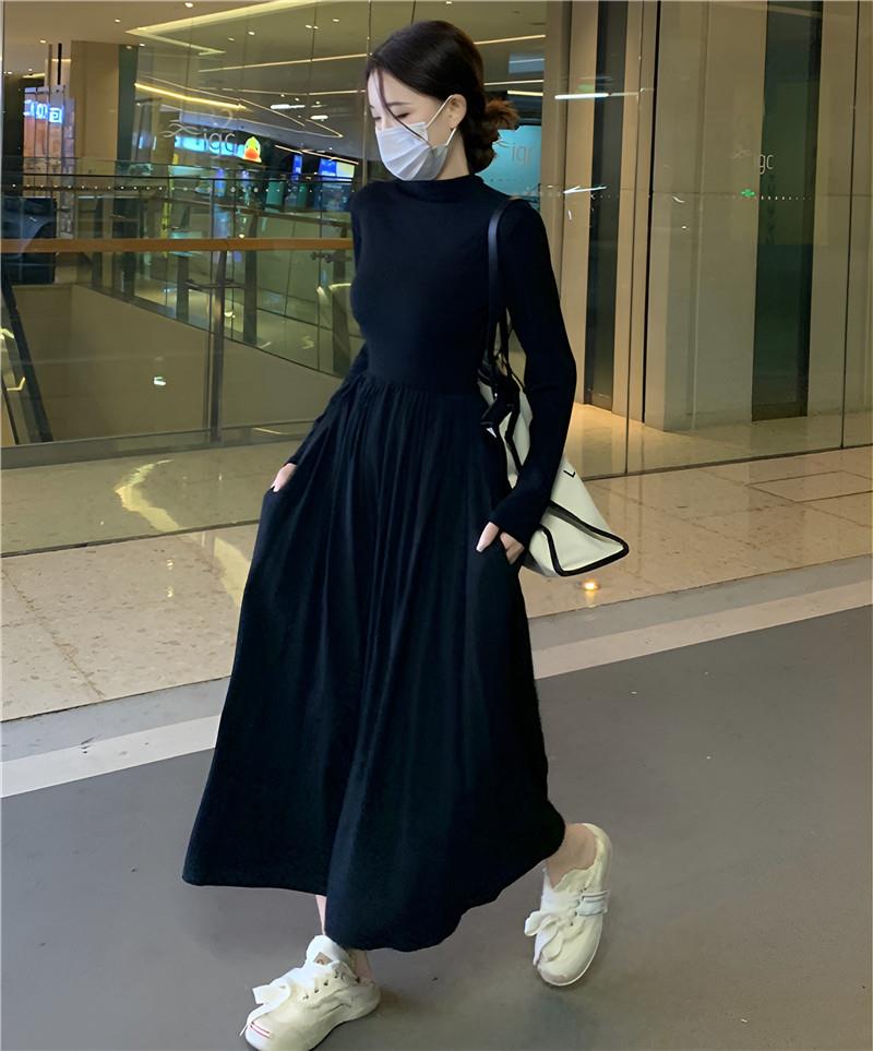 반폴라넥 슬림 긴팔 셔링 주름 A라인 플레어 롱원피스 레이어드 원피스 러블리 캐주얼 베이직 학생룩 캠퍼스룩 여친룩 데이트룩 MZ 힙한 스트릿 홍대룩 가을 데일리룩