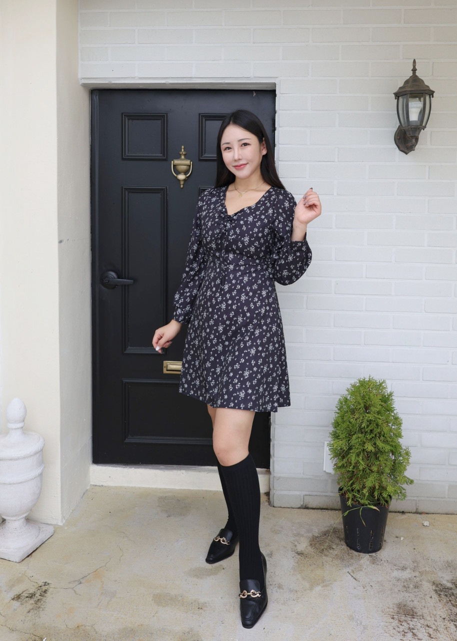 빅사이즈 플라워 셔링 긴팔 봄 벚꽃놀이 미니 원피스