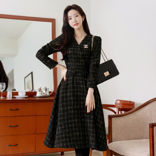 코펠라 서플리스 넥 트위드 플레어 원피스
