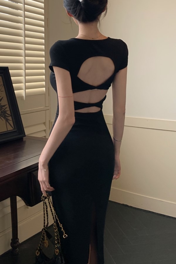 세리 블랙 백리스 라운드넥 반팔 슬리밍 롱원피스