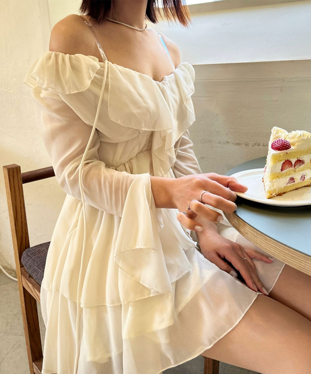 [신상할인/여리공주룩]오프숄더 초커 끈 프릴 베이지 미니 시스루 원피스