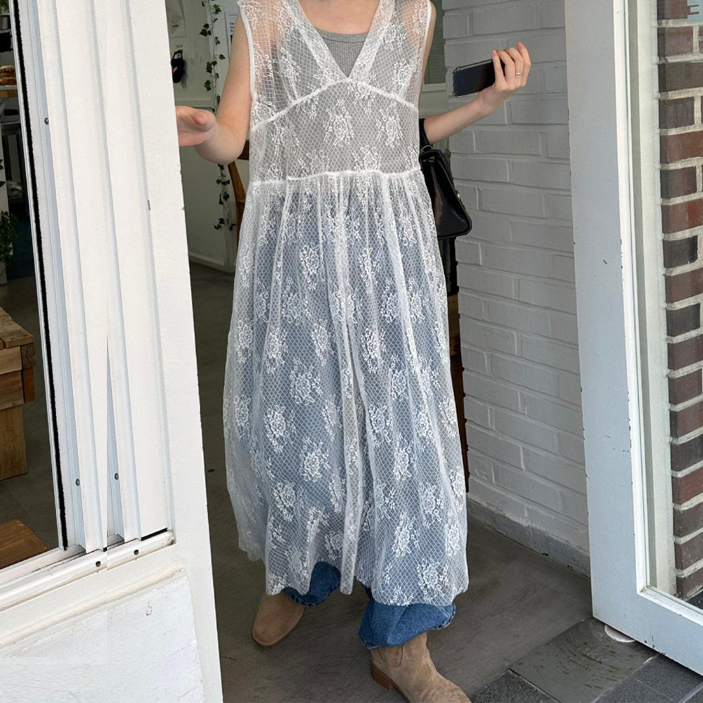 민소매 플라워 장미 레이스 뷔스티에 시스루 레이어드 롱원피스