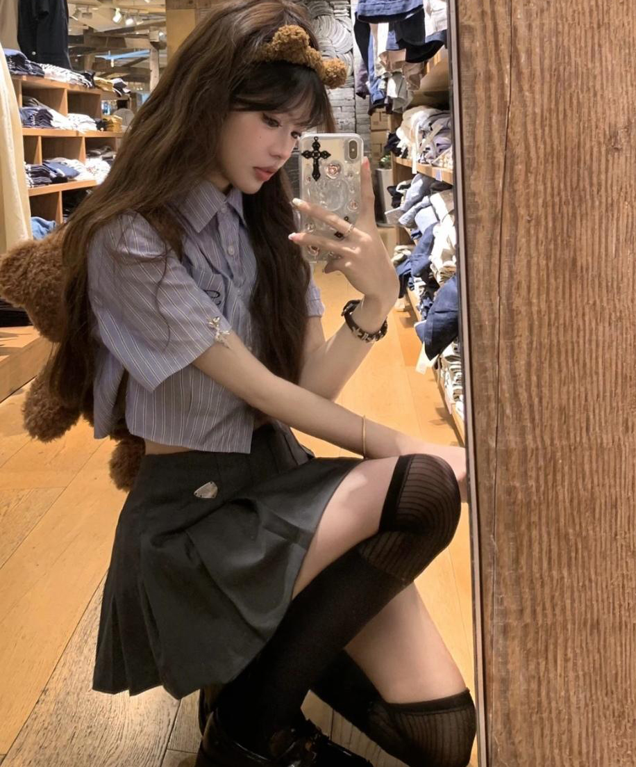 교복 코스프레 크롭 카라 셔츠/하이웨스트 플리츠 미니 스커트 코디세트