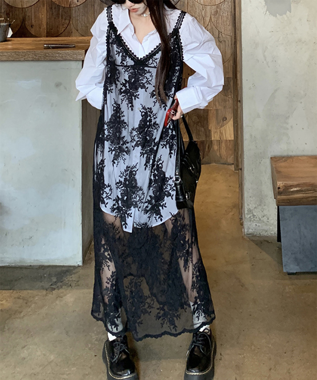 유니크 시스루 레이스 레이어드 븨스티에 롱 원피스