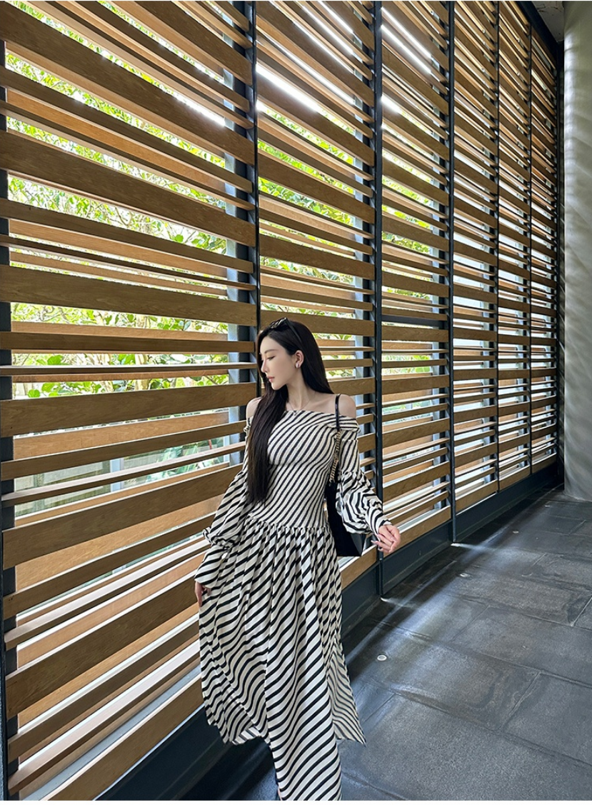SX Shanxi 프랑스어 복고풍 기질 스트라이프 A라인 드레스 여성 랜턴 소매 한 줄 칼라 하이 엔드 서양식 롱 스커트