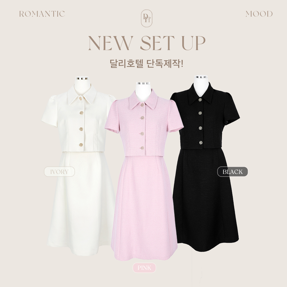 [S-L💐Premium][Dali made] 엔느 카라넥 버튼 반팔 숏 자켓 A라인 플레어 롱 스커트 트위드 셋업(하객룩/빅사이즈/상견례룩)