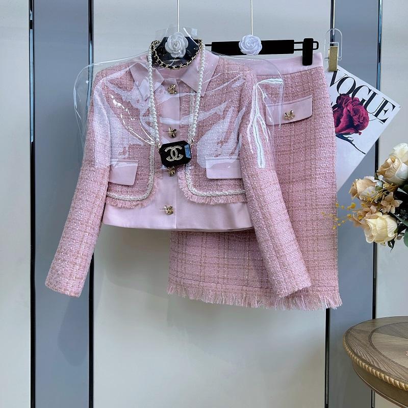 펑이 핑크 스몰 향수 슈트, 고급 트위드 재킷, 힙 스커트, 투피스 겨울 코디, 풀세트