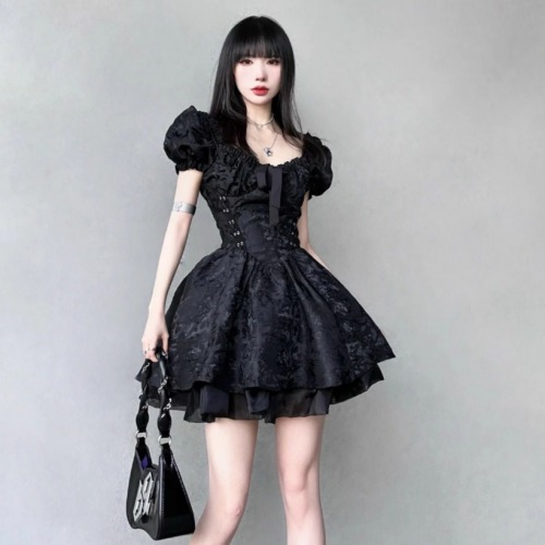 [당일출고/여름데이트룩/여름신상] 블랙 베이비돌 미니원피스 a라인 숏스커트 코르셋 퍼프소매 키치반팔 공주 리본 발레코어 원피스 미니드레스 (데일리룩 데이트룩 여친룩 하객룩 키치룩)