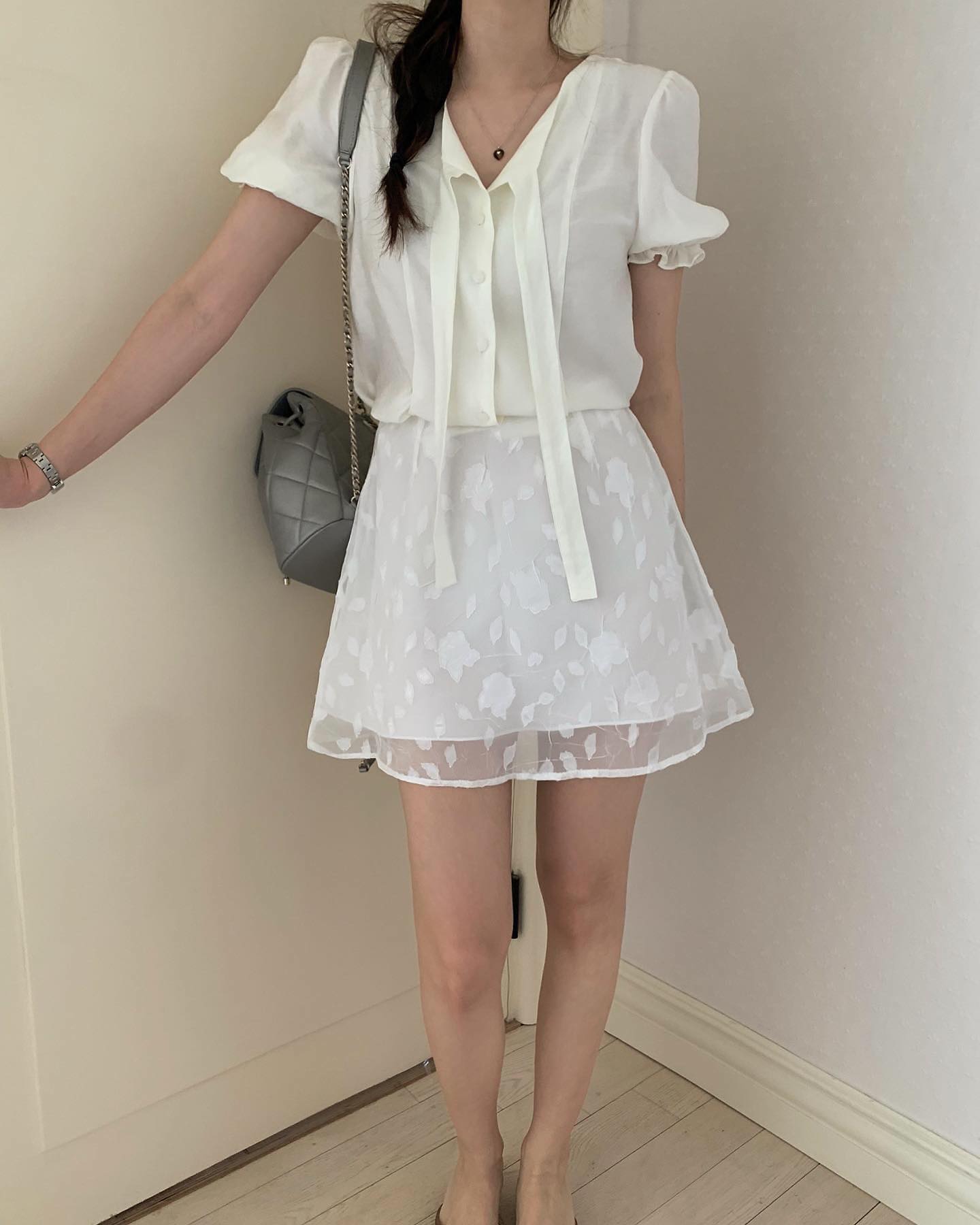 [🎀여름블라우스] 프리티영띵 딘디 반팔 타이 크롭 셔링 블라우스 2color