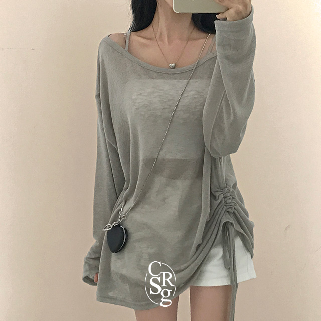 [살탐방지/린넨] 오프숄더 셔링 시스루 긴팔티셔츠