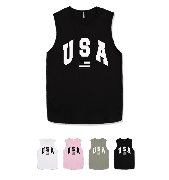 [4컬러] USA나시티셔츠 나시 남여공용 민소매 면 영문 프린팅 여름 남자나시 여자나시 라운드 커플나시 커플티 면나시티셔츠 박스티 아메리카 성조기