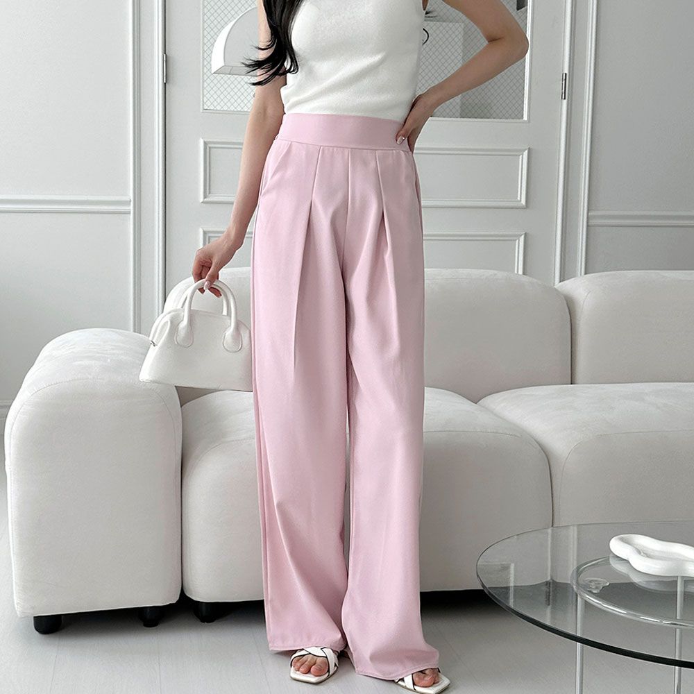 옂 싱글 핀턱 허리 하프밴딩 디테일 와이드핏 롱 팬츠