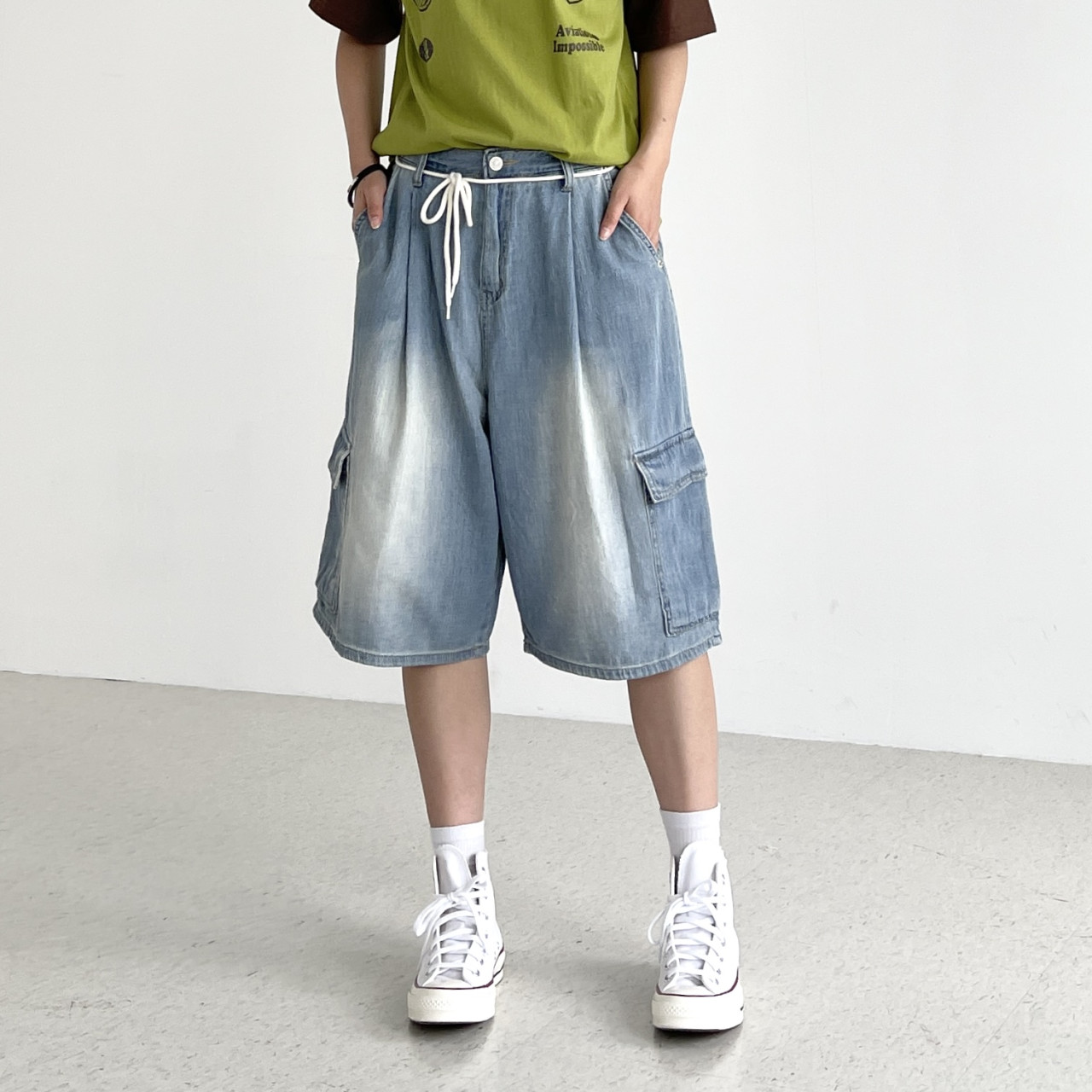 버뮤다팬츠 여름 청반바지 여자 키작녀 데님팬츠 통 얇은 핀턱 카고 와이드 7부 청바지
