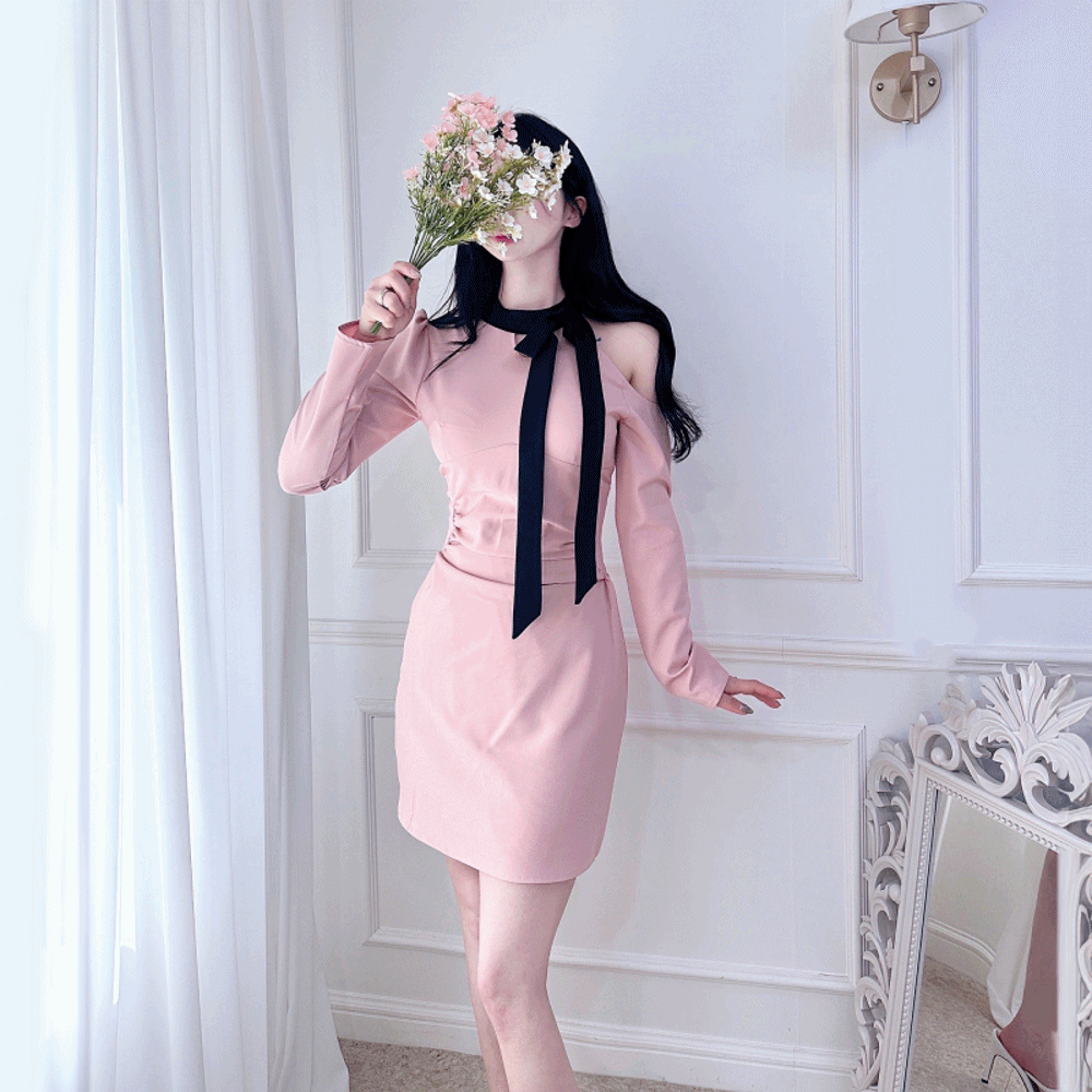 [단독 기획오더💗] 에테르니티 리본 핑크 언발 오프숄더 미니 원피스 (good quality 핑크 결혼식 하객룩 발레코어 연말룩 연말 하객 파티룩 파티 아나운서 데이트룩 봄 )