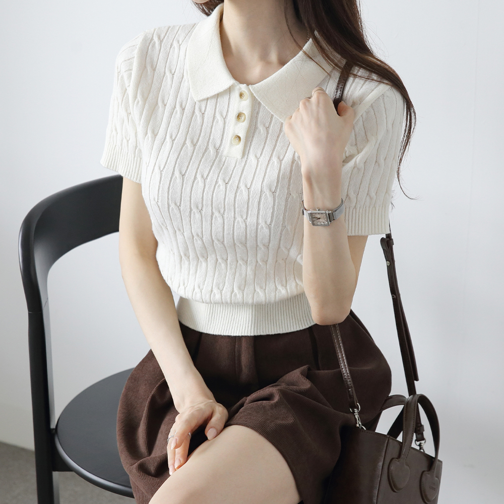 만능 코디 클래식 꽈배기 카라넥 세미크롭 반팔 니트웨어