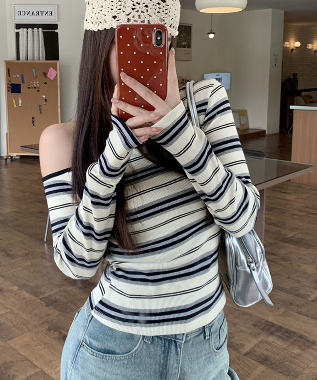 [HIP&캐주얼] 제인 원숄더 스트라이프 니트 탑