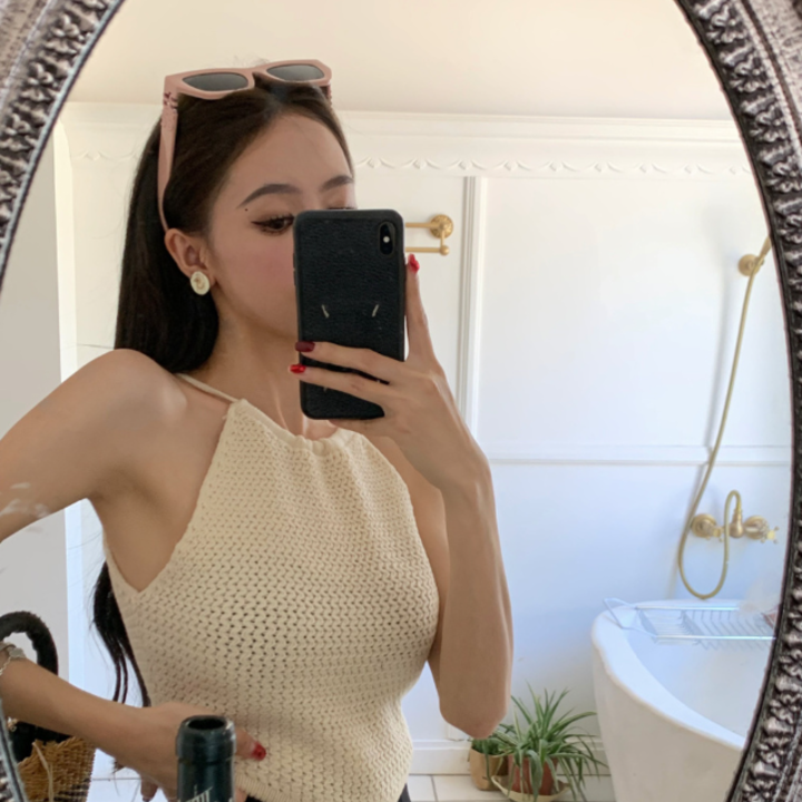 아만다 휴양지 백트임 펀칭 크롭 그물 니트 나시
