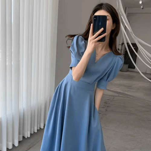 [하객룩/정장원피스/결혼식룩] 여름원피스 블루 여성정장 퍼프 블라우스 핀턱 정장스커트 허리슬림 일자핏 롱원피스 77 88 슬림라인 일자 롱 스커트 쉬폰 하객룩 원피스