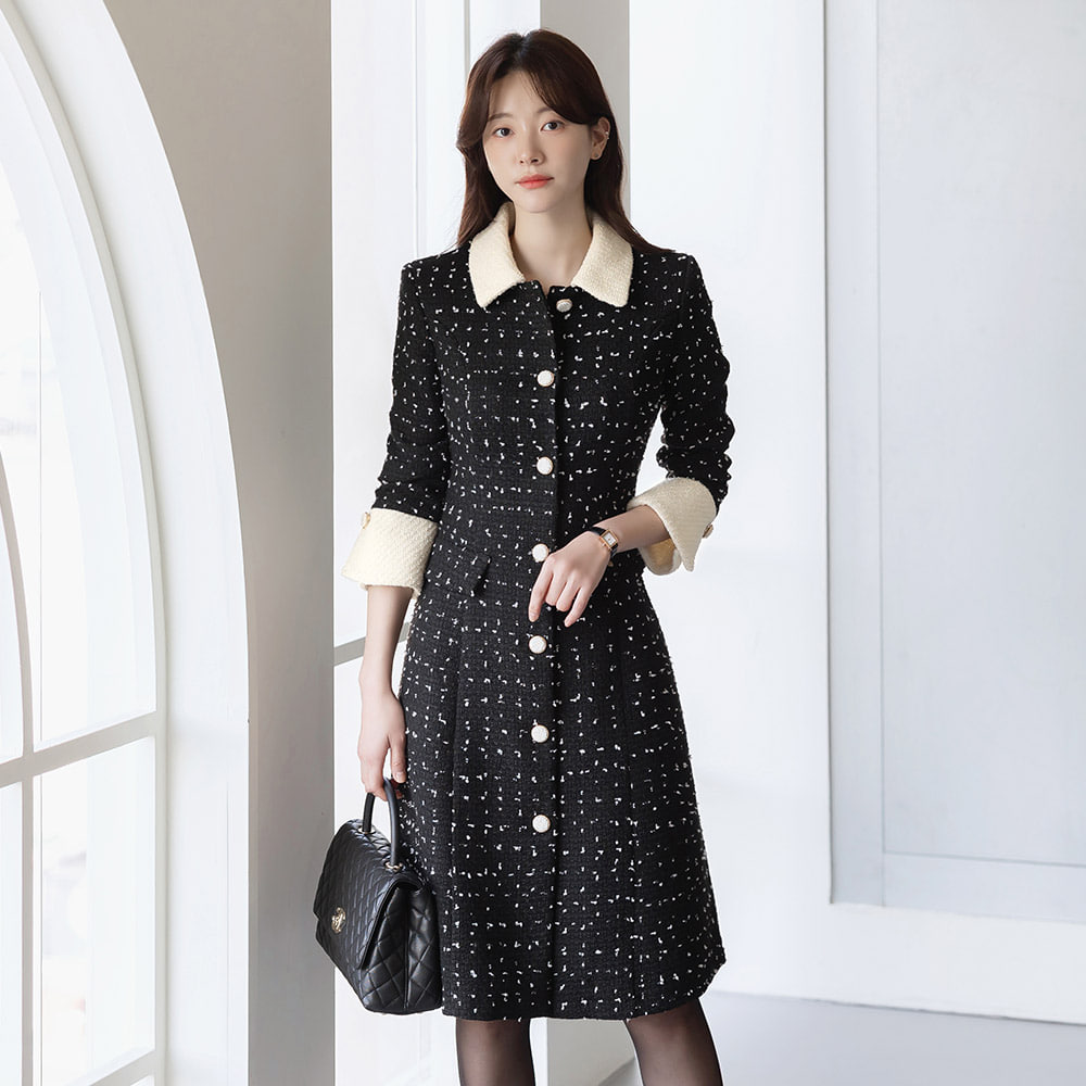 리에이 배색 와이드 커프스 트위드 원피스