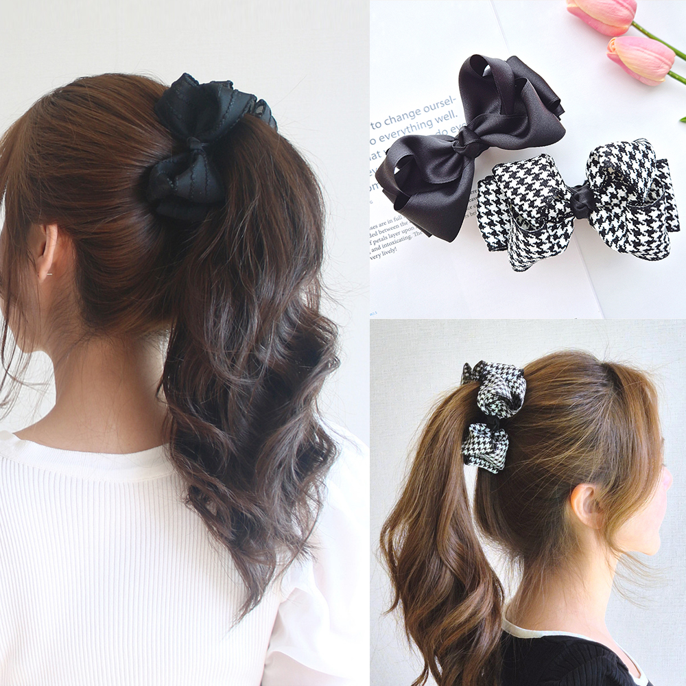 [자체제작] 리본 바나나 집게핀 체크 블랙 포니테일 머리핀 왕리본삔 반묶음 단발머리 헤어핀