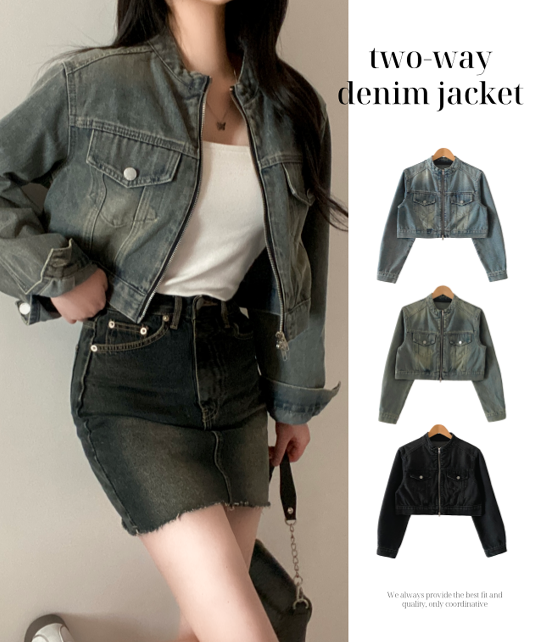 [고퀄탄탄✨/핏보장!/청순힙] 빈티지 워싱 투웨이 노카라 크롭 긴팔 데님 청자켓 집업
