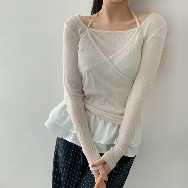 [💕여리핏/리뷰이벤트💕]여친룩 발레코어룩 레이어드 홀터넥 트윙클 랩 긴팔T