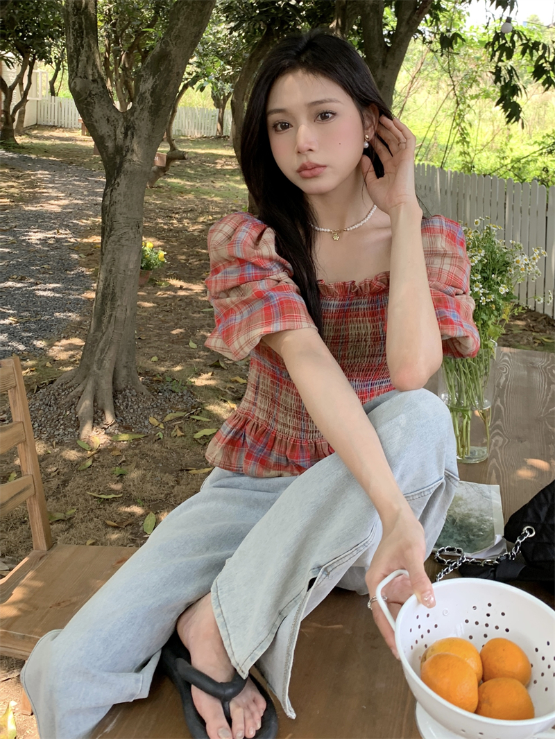 (당일발송)체크 스퀘어넥 퍼프 슬리브 스모크 롱원피스 엘리스톤A8689