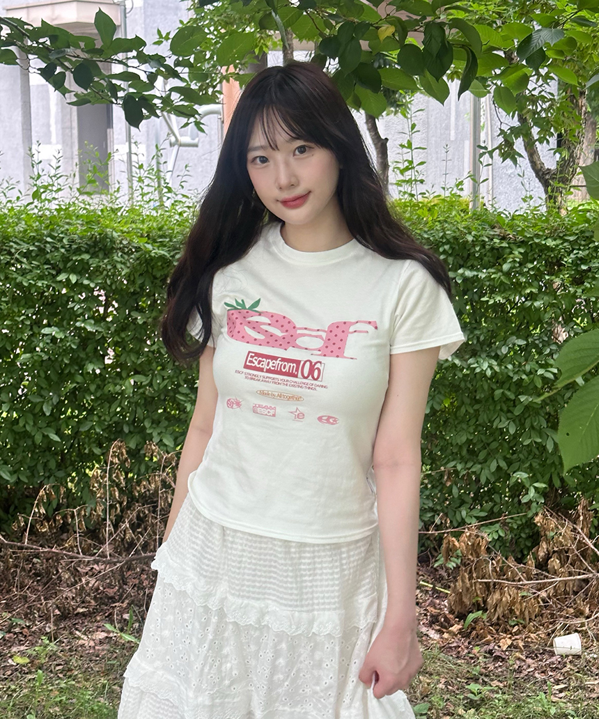 스트로베리 도트 ESCF 로고 콜라주 프린트 슬림핏 반팔티 아이보리