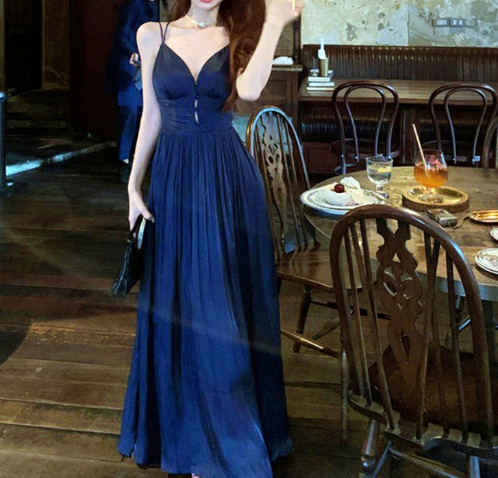 네이비 펄 실크쉬폰 스트랩 캡내장 백스모킹 드레스