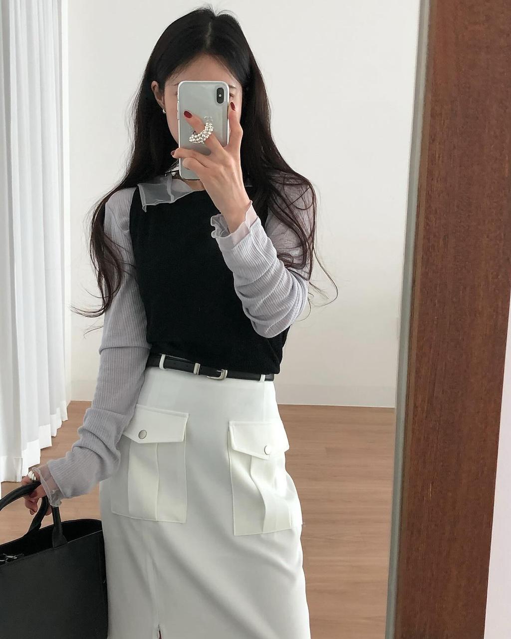 럼비 여성 여름 레이어드 이너 하객룩 출근룩 오피스룩 시스루 오픈카라 프릴 티셔츠