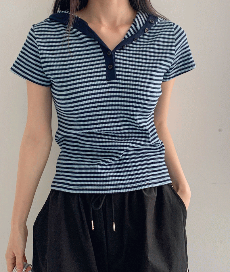 코민 스트라이프 후드 티셔츠 (반팔, 스판)