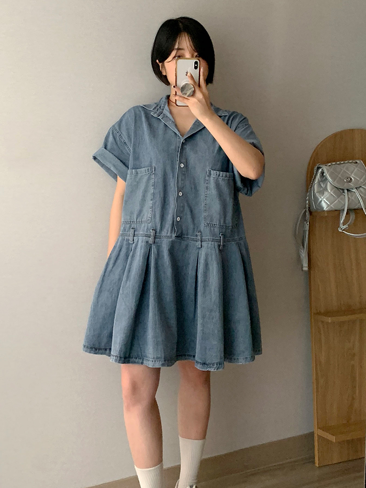 [66-통통88] 이든 청 핀턱 미디 원피스