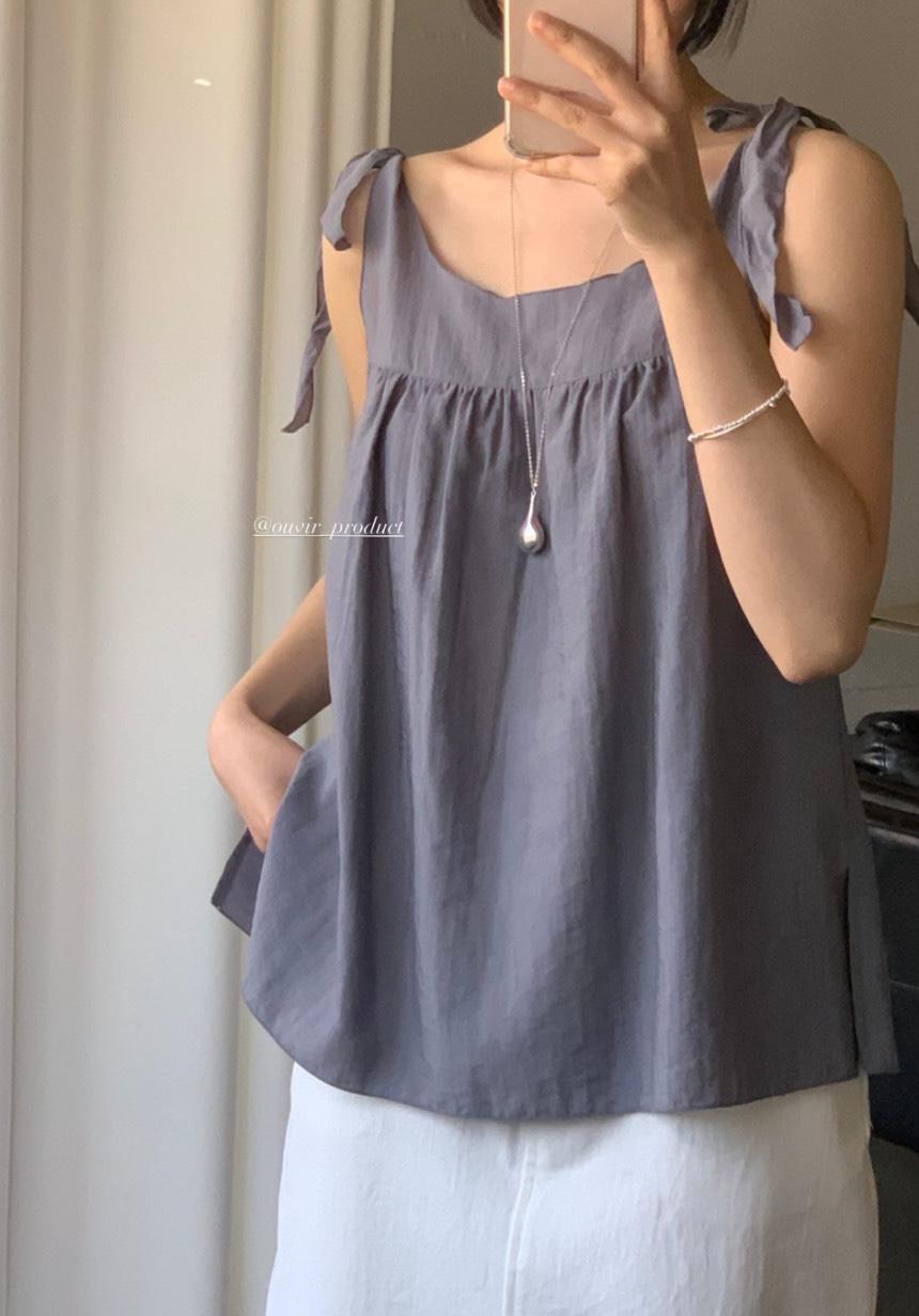 [화이트 당일출고] 오비르 트위그 나시 블라우스 레이어드 민소매 리본 셔링 bl