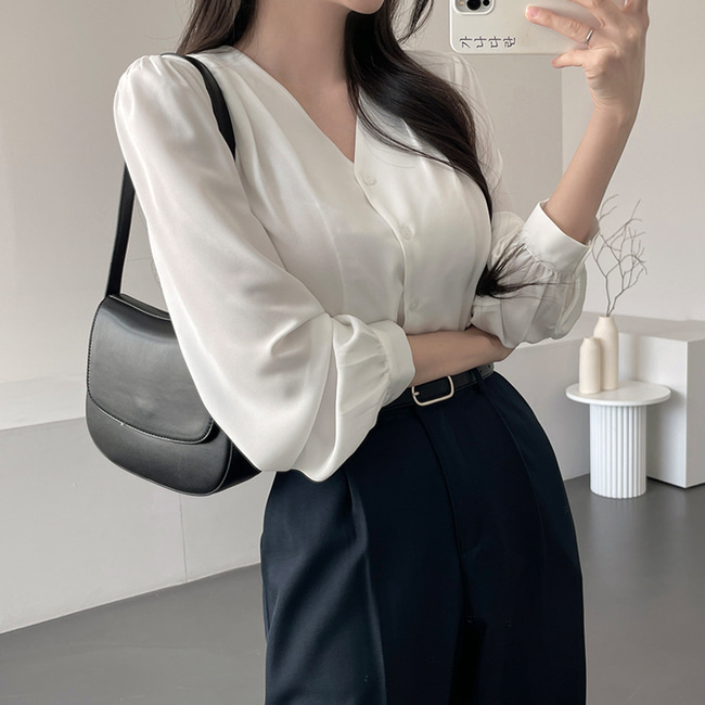 [직장인추천🩶] 가나다란 글로비 우아한 브이넥 핀턱 셔링 하객룩 블라우스 2color