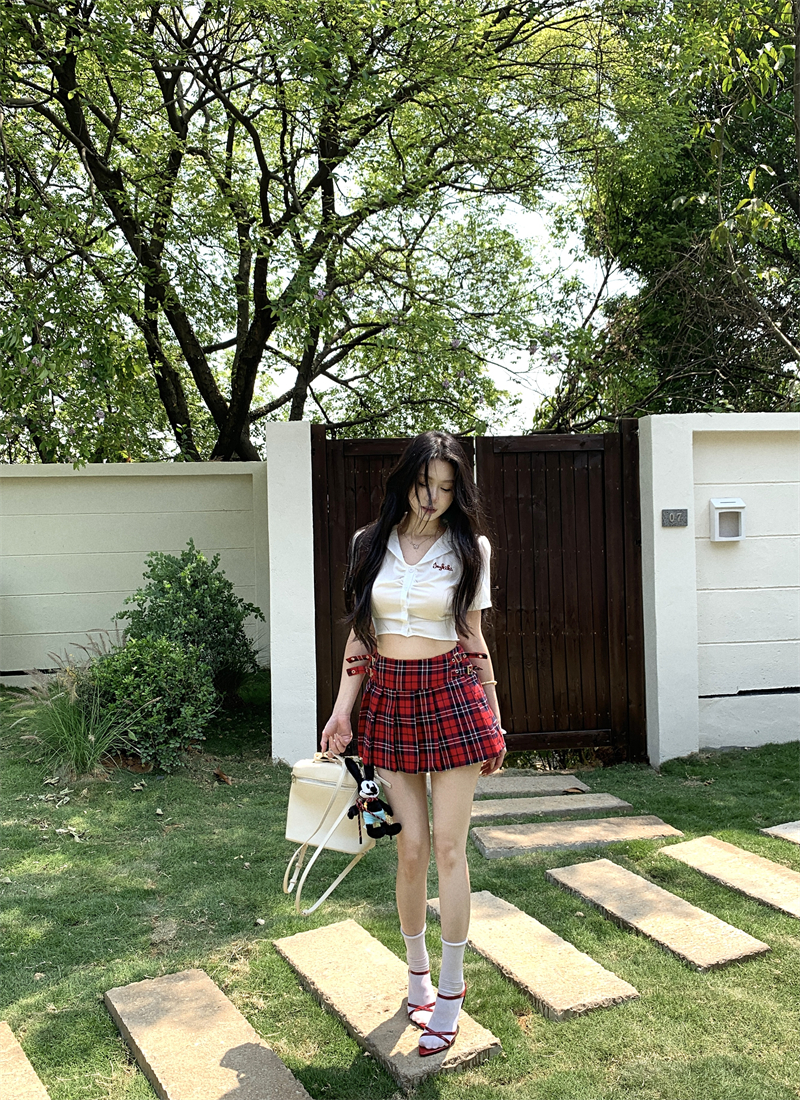 (코디세트)레터링 배색 자수 크롭 반팔 셔츠+체크 플리츠 미니스커트 세트 다히다EK174