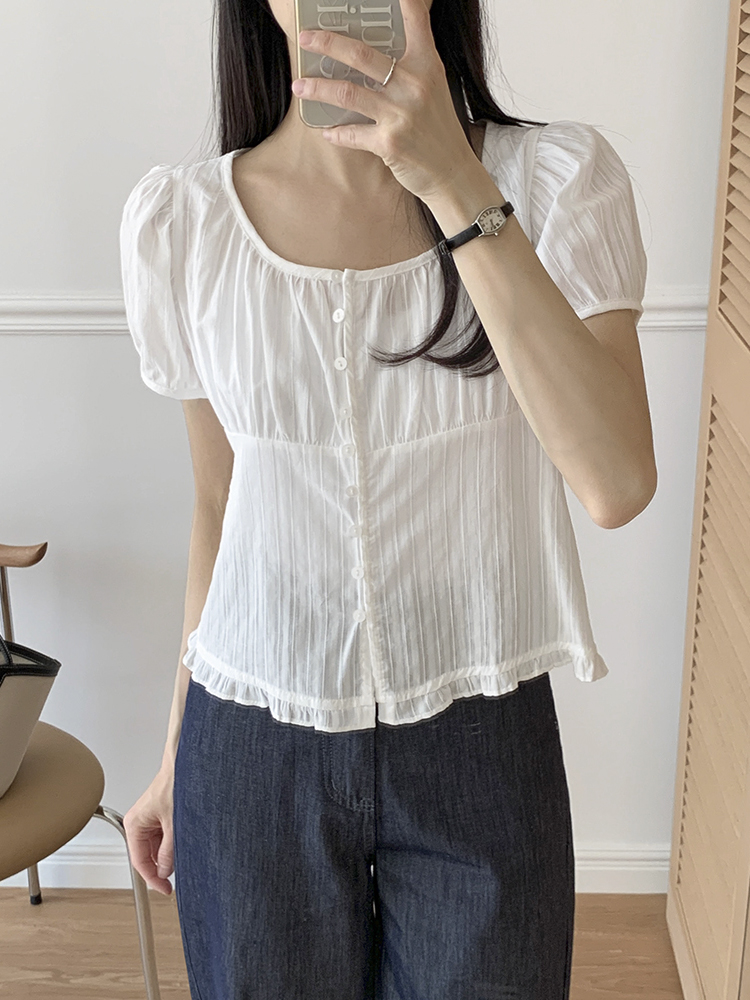 [휴양지] 아이비 자수 프릴 유넥 반팔 블라우스