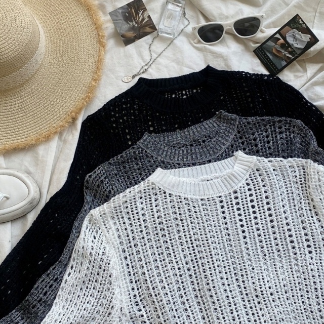 [허리핏조절!/시스루무드] 시스루 펀칭 루즈핏 언발 트임 리본 라운드 커버업 긴팔 스카 니트
