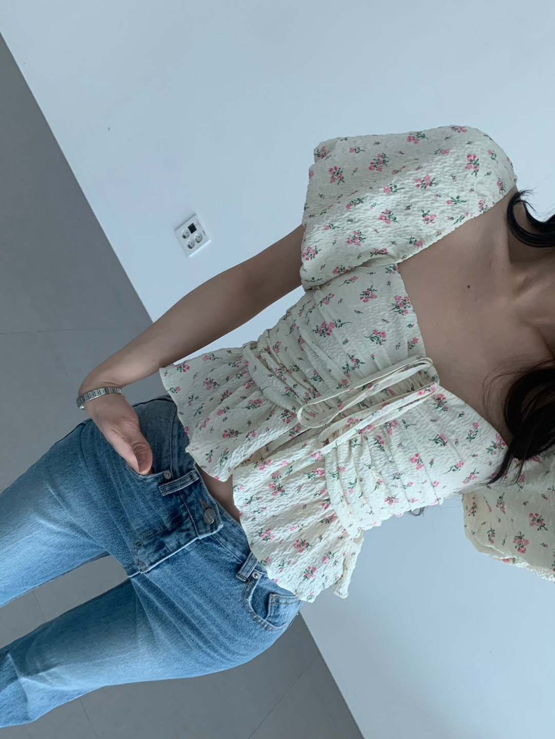 [러블리/여행룩추천❤️] 플라워 셔링 퍼프 프릴 크롭 블라우스 2color