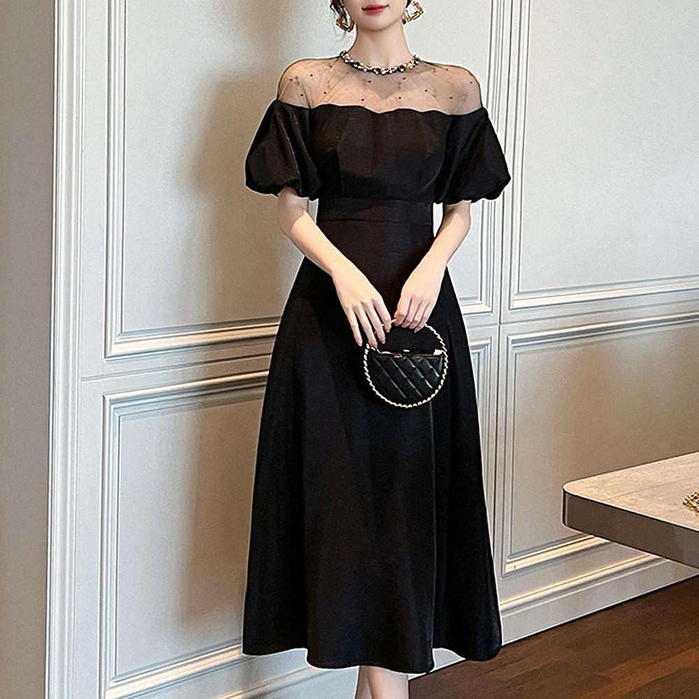 블랙 셀프웨딩드레스 엘리제 보석 네크라인 시스루 오프숄더 볼륨소매 파티룩