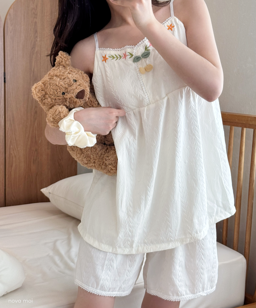 내장캡 그렌델 체리 나시 노브라 잠옷 세트 여름 파자마 자수 반팔 홈웨어