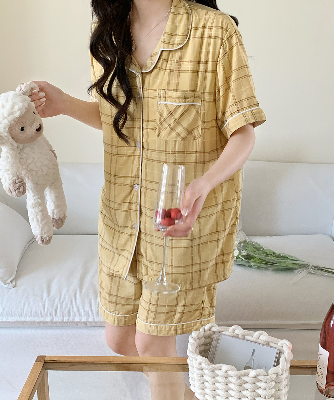 노브라OK 쿨링소재 허니옐로체크 커플 잠옷 여름 파자마