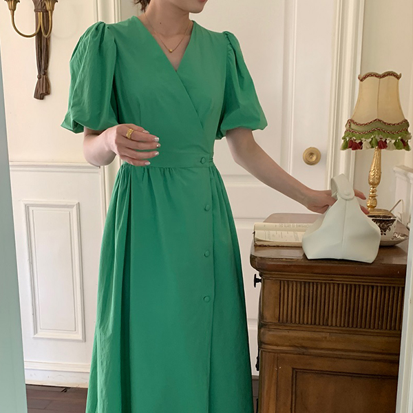브이넥 퍼프 숄더 랩 롱원피스-pj52841 A38059