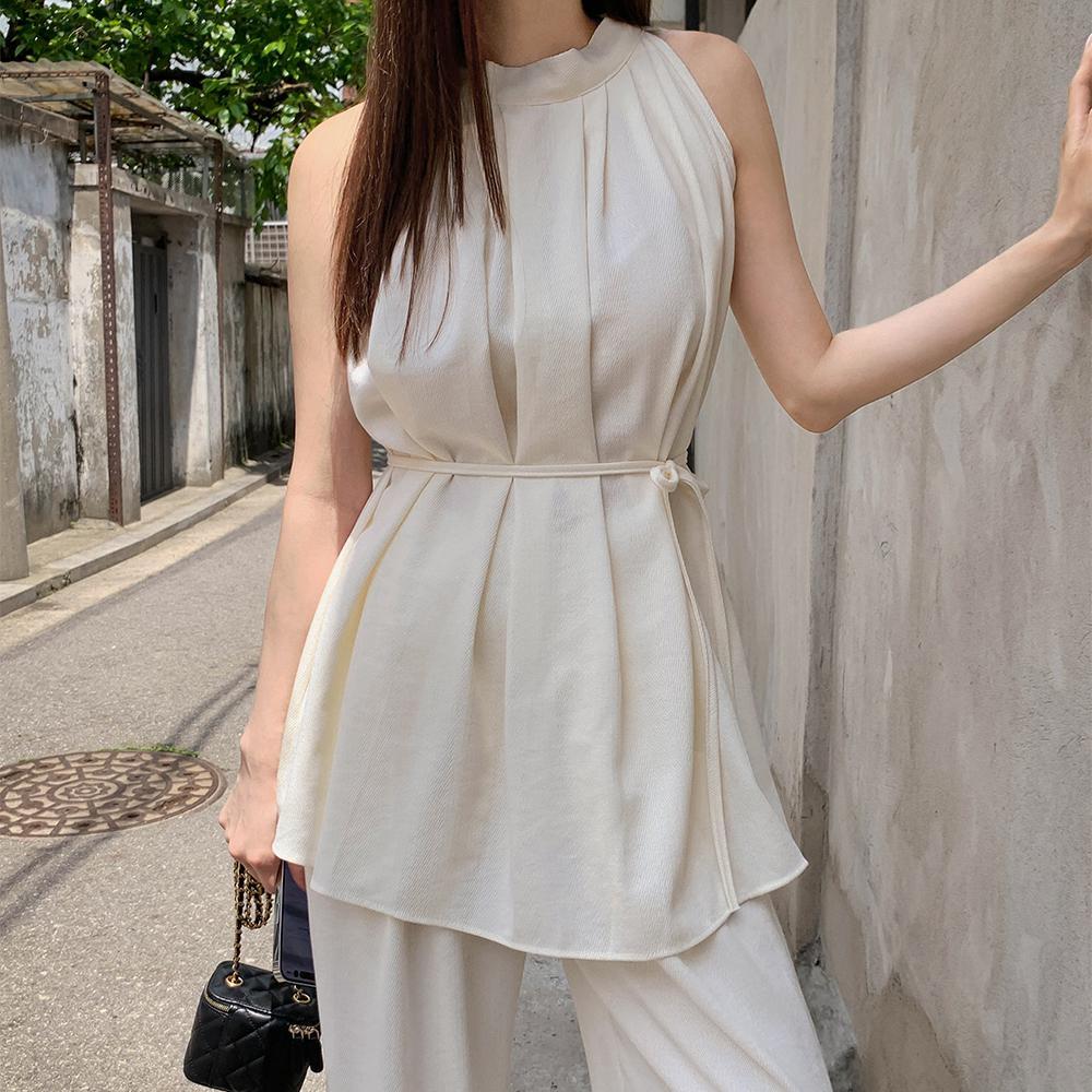 [MD PICK💗]누아 홀터넥 벨티드 셔링 블라우스 밴딩 와이드 슬랙스 셋업(출근룩/휴가룩/여행룩)