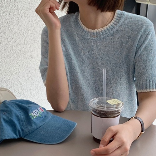 아홉 여름 크롭 반팔 니트 라운드넥 루즈핏 썸머니트 데일리룩 꾸안꾸 아이스 니트 블루 니트탑
