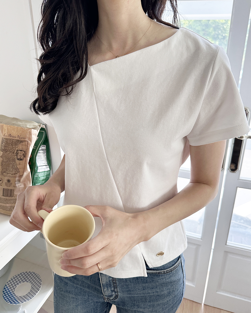 [국내제작] 모던 언발란스 넥라인 셔링 반팔 블라우스 스판 티셔츠 2color