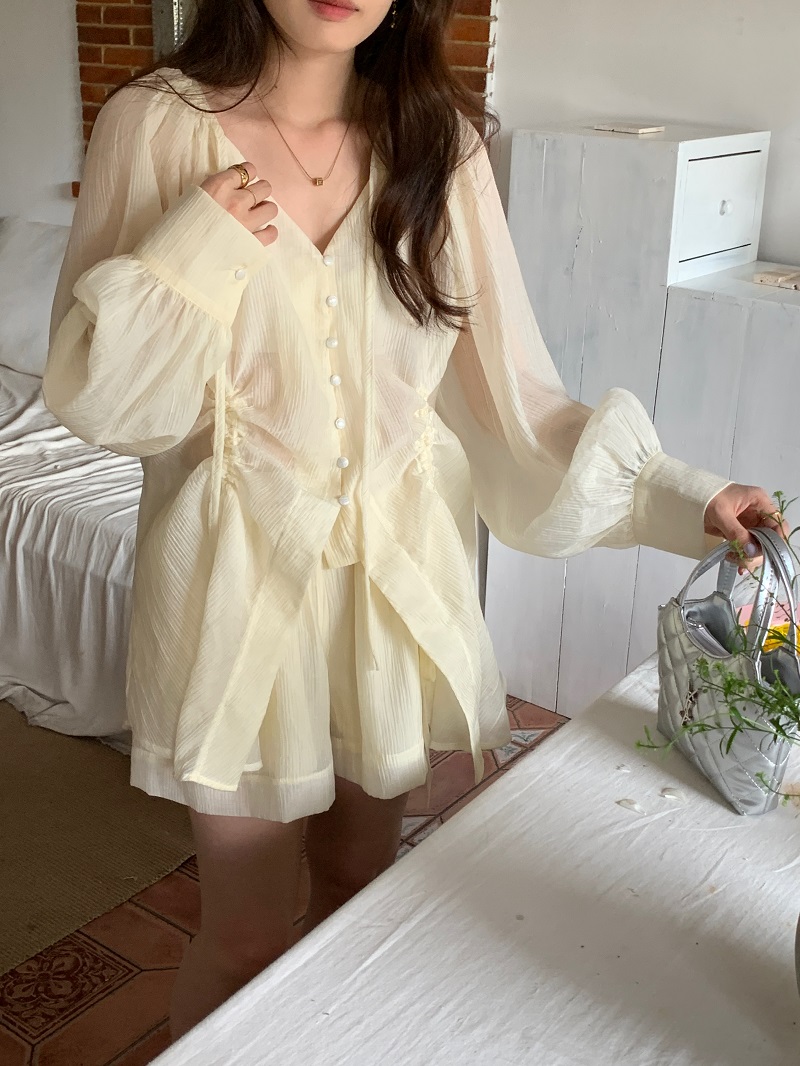 (코디세트)브이넥 스트링 셔링 롱슬리브 셔츠 하이웨스트 와이드 쇼츠 세트 (코디세트) BB340868 플라인FL