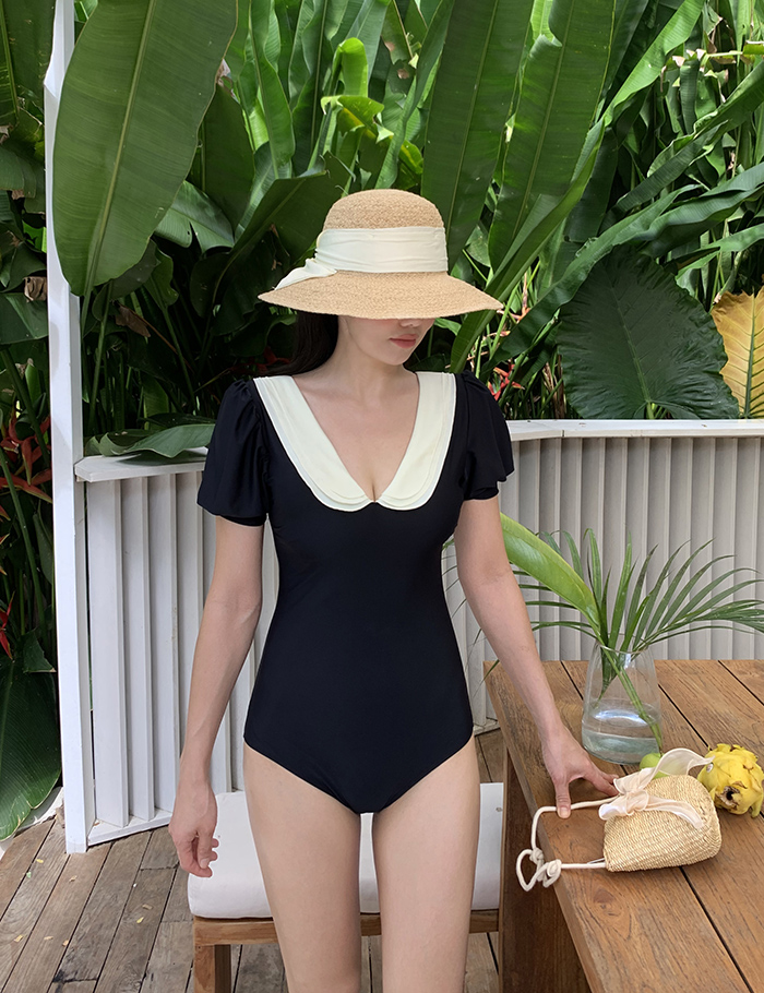 [배색 카라 블랙 원피스수영복] 땡큐 모노키니 + 치마 세트